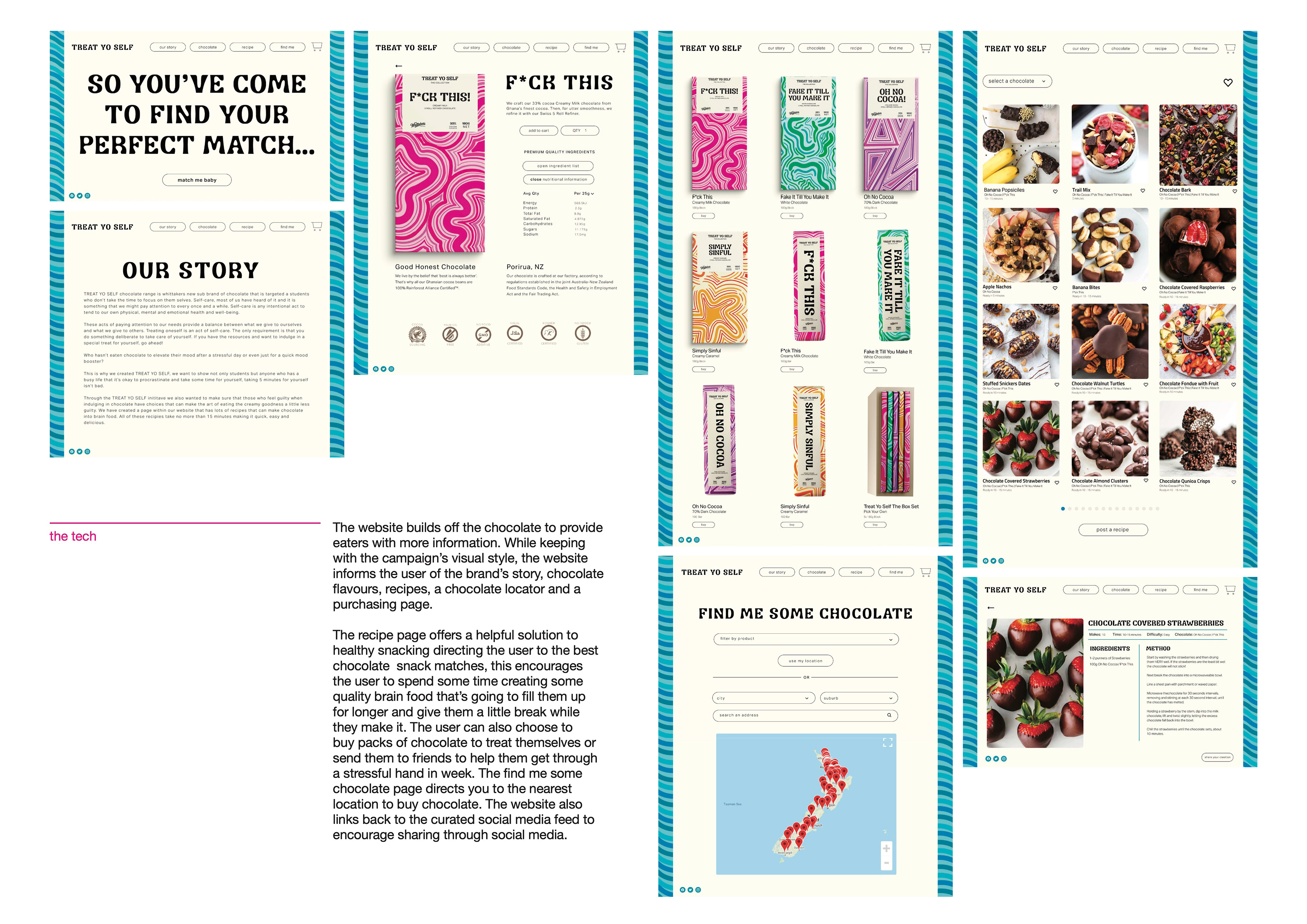 Students often use snacking to procrastinate when studying or completing university projects. What most students have in common is using food as a delaying tactic, procrastin-eating! Treat Yo Self was a student-designed sub-brand of Whittakers. Treat Yo Self gives students accessible alternatives to unhealthy snacking that still incorporates chocolate without all of the guilt.
