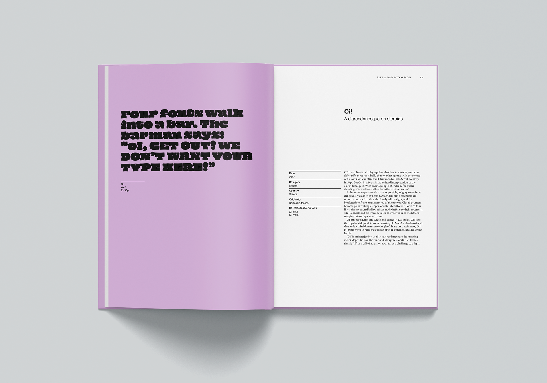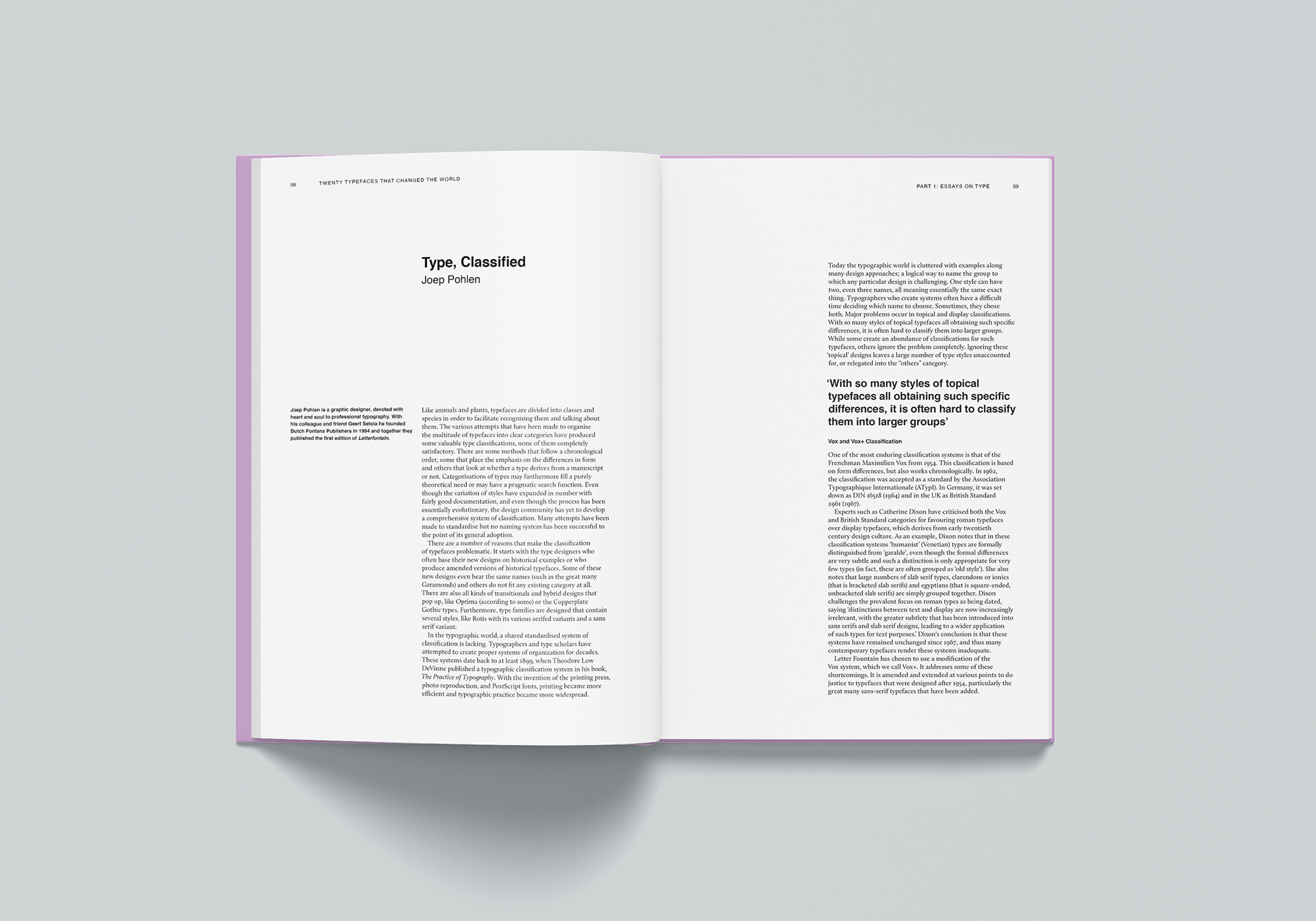 Twenty Typefaces that Changed the World, is a 120-page book that explores, examines and defines some of the most influential typefaces of the 20th century. Made up of two sections, the first explores essays on typography, and the second consists of a curated selection, arranged by serifs, sans serifs, scripts and display styles. Displays of typeface variations have been used alongside selected images, to develop a consistent system throughout the publication. Through layout, typeface choice, image, phrase and line the objective is to bring recognition to the history of typographical advances.